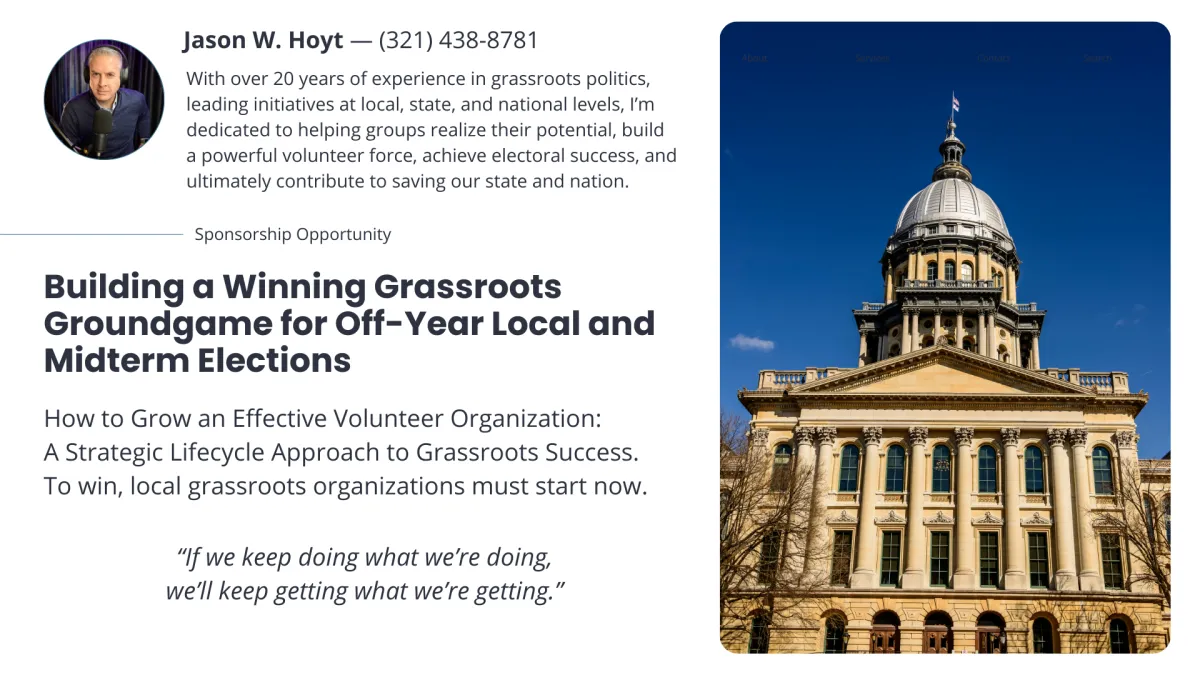 With over 20 years of experience in grassroots politics, leading initiatives at local, state, and national levels, I’m dedicated to helping groups realize their potential, build a powerful volunteer force, achieve electoral success, and ultimately contribute to saving our state and nation.